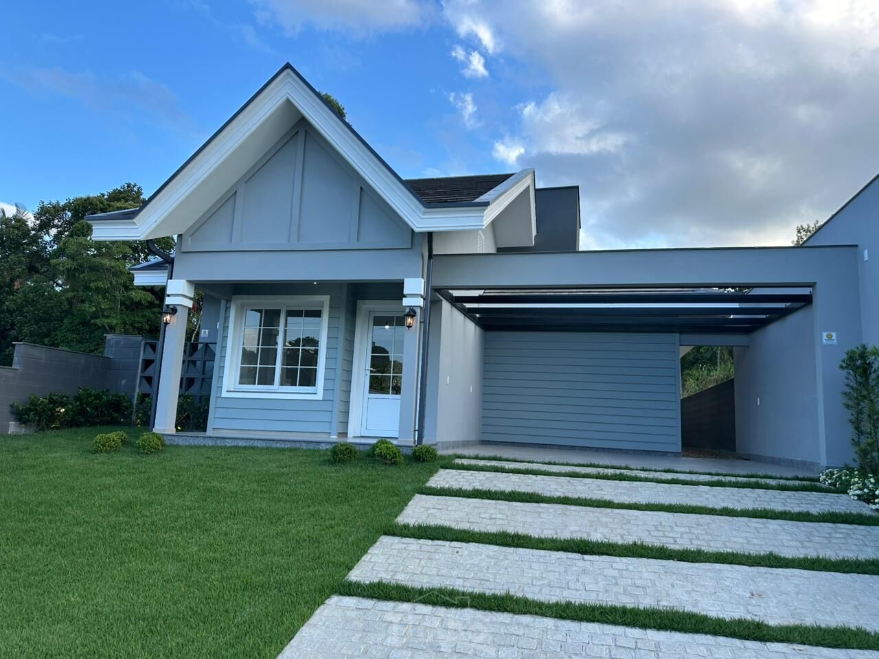 • Paredes da varanda e garagem em clapboard estilo americano, reforçando a arquitetura diferenciada;