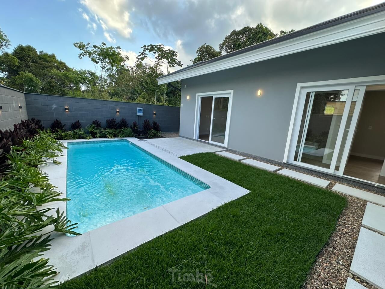 • Paisagismo com plantas diversas, grama esmeralda e iluminação decorativa;